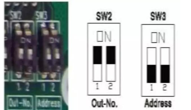 地址碼(Address)為1號,也就是兩位撥碼開關(guān)不動(dòng),撥碼位置是“ON、ON”方向,數(shù)量碼(Out)為3臺,兩位撥碼開關(guān)為“ON、OFF”,轉(zhuǎn)接碼和地址碼一樣。