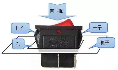 安裝的時(shí)候,船型開(kāi)關(guān)兩側(cè)面有兩個(gè)開(kāi)口卡子,將開(kāi)關(guān)對(duì)準(zhǔn)板子上的孔向下推,等待卡子將開(kāi)關(guān)固定在板子上即可。